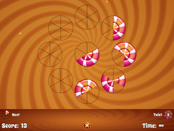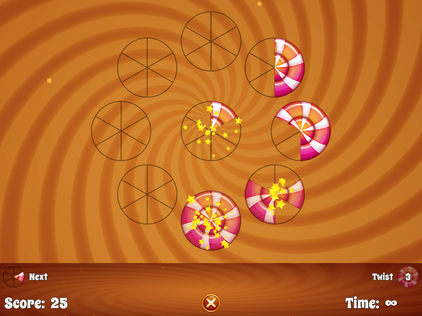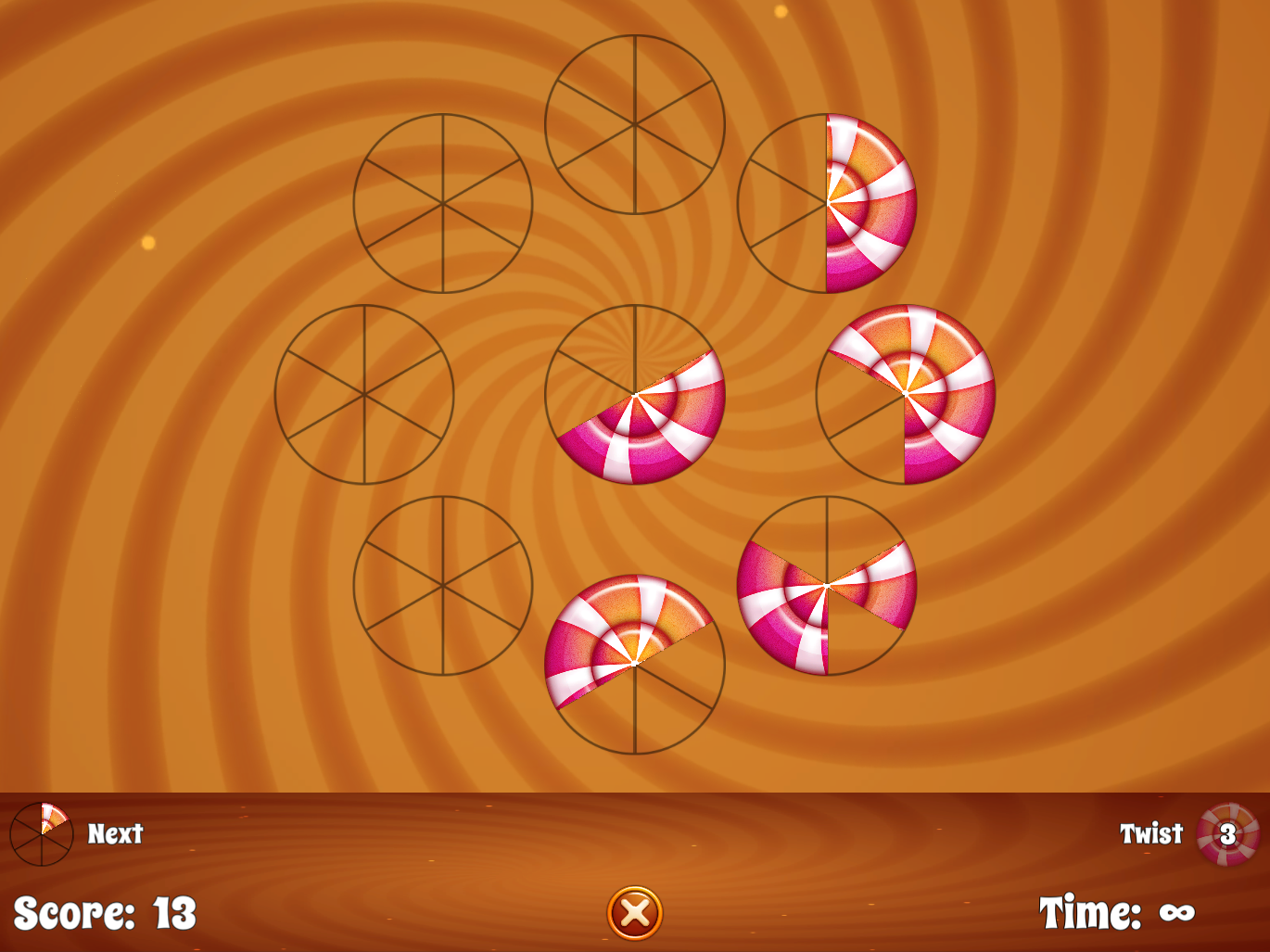 Tap the outer circles to place the current candy piece. Once a candy has been completed it will be removed form the board along with the adjacent pieces. If you run out of moves tap the Twist button for a second chance. But beware - if you run out of Twists, it's game over!